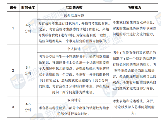 雅思考试口语部分通过考生与考官之间进行一对一交流的形式对考生的英语口语水平进行考察,考官将在口语考试全程对考生表现进行评分,口语考试分为三个部分,考生可以以此使用不同的口语表达技能,雅思考试口语部分将被录音。