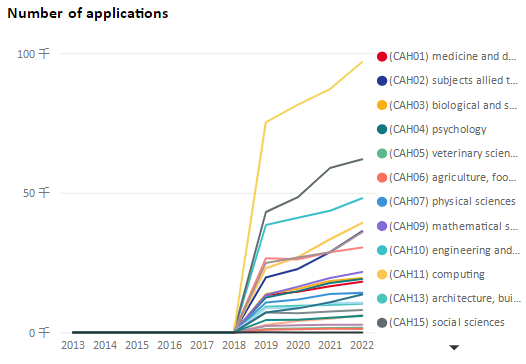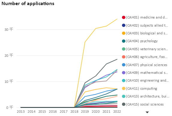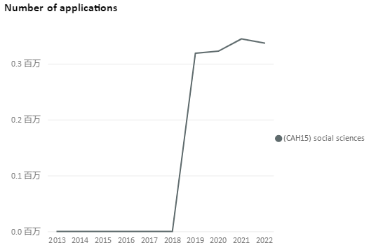 社会科学热度也非常高,今年有336,930人提交相关申请,但比之2021年(344,530),申请人数还是有所下降。