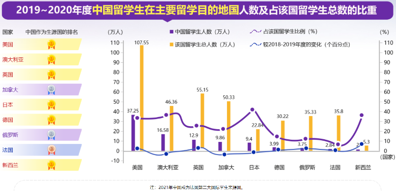 根据全球化智库编写的《中国留学发展报告(2022)》蓝皮书,2019~2020年度,中国仍然是比较大的留学生来源国,有接近100余万学生在境外高等教育机构就读,前五大留学目的国为美国、澳大利亚、英国、加拿大和日本。