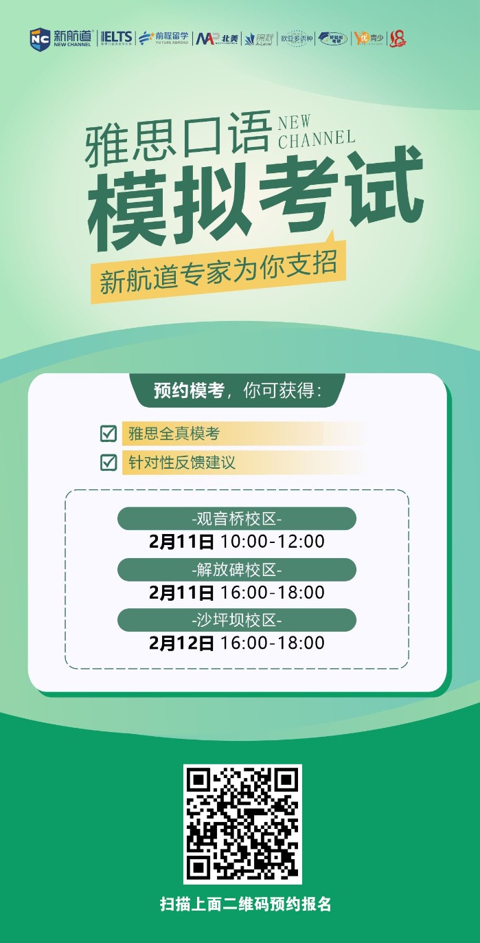 雅思口语是雅思考试中很重要的科目,很多考生经常在这个部分栽跟头,所以要想拿到高分成绩,平常的雅思口语练习必不可少,为了提升大家在雅思口语方面的能力,新航道重庆学校为各位学员推出了三场雅思模拟考试,采取的是全真模拟考试,考试过后老师会针对性的给大家提出复习建议。