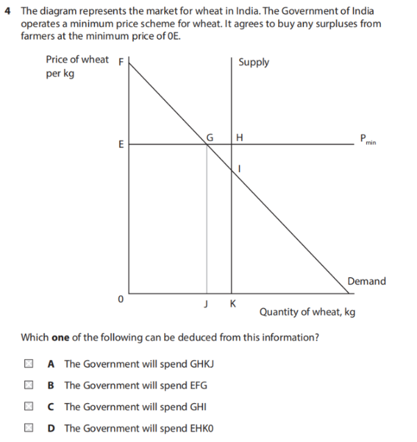 第四题:因为政府是打算买下在0E这个minimum price导致的任何surplus,所以先找出surplus的位置GH,这个部分再乘以价格0E,就是政府的支出。