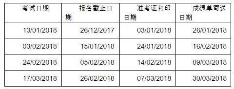 2018年1月至3月用于英国签证及移民的雅思考试报名截止日期、准考证打印日期和成绩单寄送日期