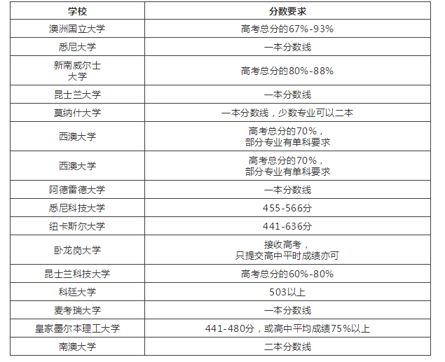 注:申请澳大利亚大学一般要求高考分数一本线以上;雅思6.5~7.0分(单项6.0分)以上;提供高中三年成绩。