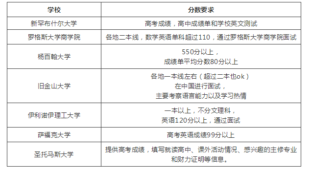 目前,接受高考成绩的美国高校有:旧金山大学、伊利诺理工大学、杨百翰大学、萨福克大学、圣托马斯大学、罗格斯大学商学院、新罕布什尔大学。