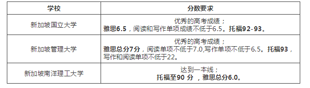 新加坡的大部分高等院校要求学生提供高考成绩,并且成绩越高,可申请的学校越好、选择面越广。一本线以上的学生,可申请:新加坡国立大学、新加坡管理大学、新加坡南洋理工大学。