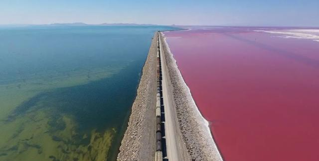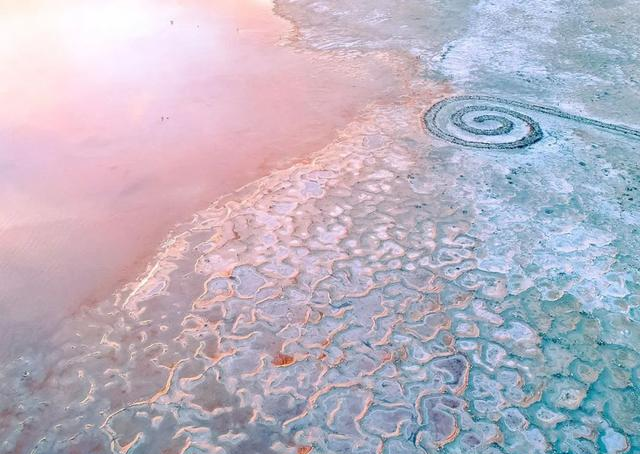 从空中看被粉色湖水充满的Spiral Jetty仿佛一颗巨大的粉色棒棒糖浸在果汁里,鲜活可爱。
