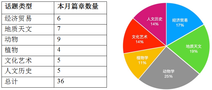 5月共有7场线下托福考试,日期分别是4日(工作日场)、14日、18日(工作日场)、21日(上/下午场)、25日(工作日场)及29日。7场考试的阅读部分一共考查到了36篇文章。人文历史话题的比例有所下降,而生物、经贸、历史类话题的占比依旧很高。本月考试重现了始祖鸟、尼罗河、冰川等高频话题,大家可以作为背景补充的重点。