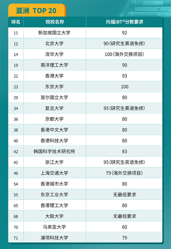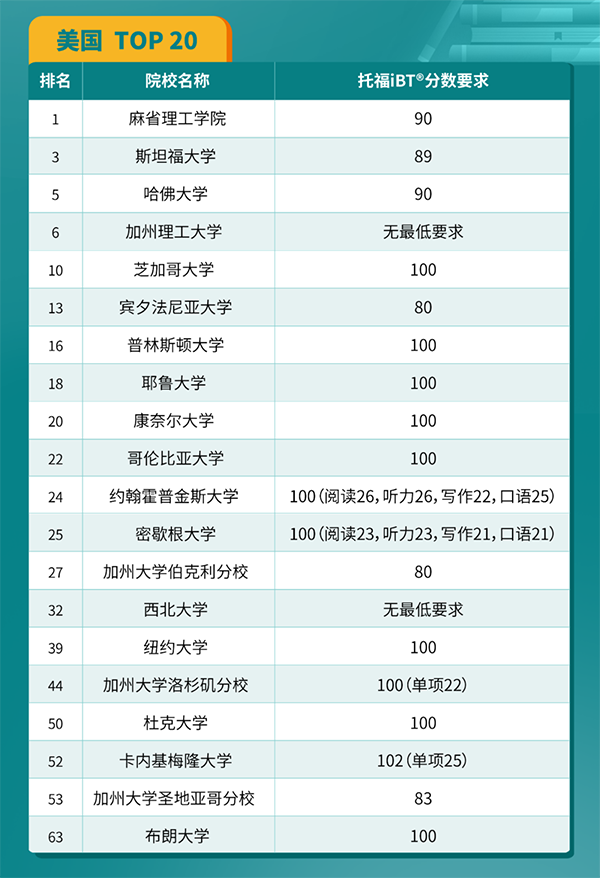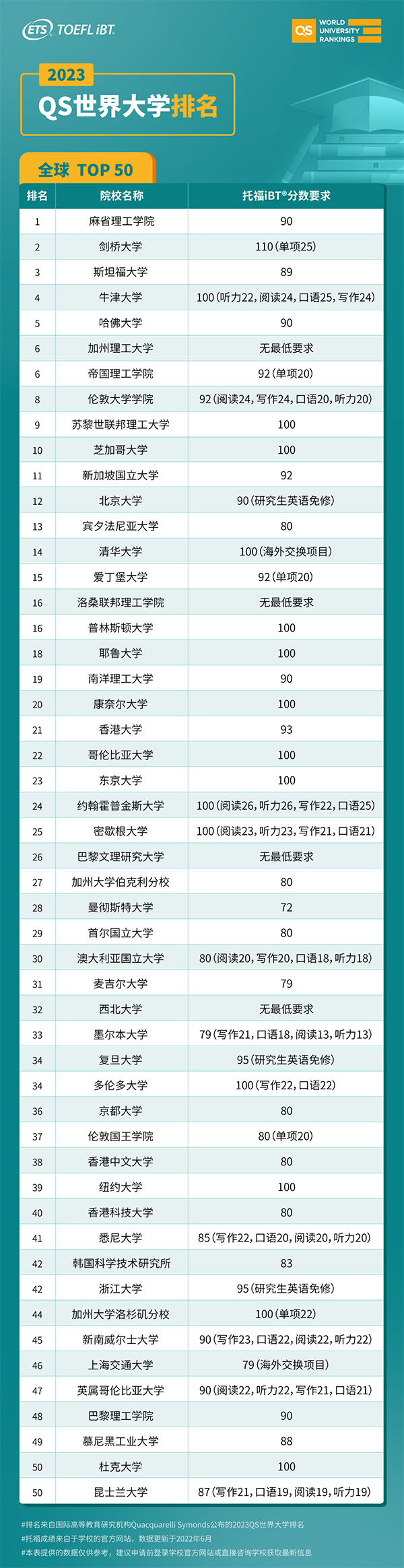 今天来看看世界TOP50大学,托福要求是多少。首先来看下,进入TOP50榜单的都有哪些大学。
