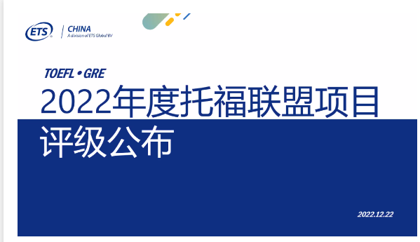 2022年12月22日,新航道国际教育集团作为ETS托福联盟的重要合作机构之一,受邀参加ETS中国2022年度托福 · GRE研讨会。2022年度托福联盟项目(TOEFL Circle Program)评级结果也在本次研讨会中揭晓。