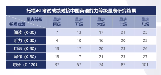 2019年12月11日,托福iBT考试成功对接中国英语能力等级量级(CSE),该量表中的四级到八级可分别对应托福考试总成绩的37分到101分。