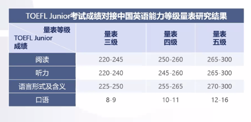 2022年5月9日,TOEFL Junior考试成功对接中国英语能力等级量级(CSE),该量表中TOEFL Junior考试分数对应《量表》的三级、四级和五级三个等级。