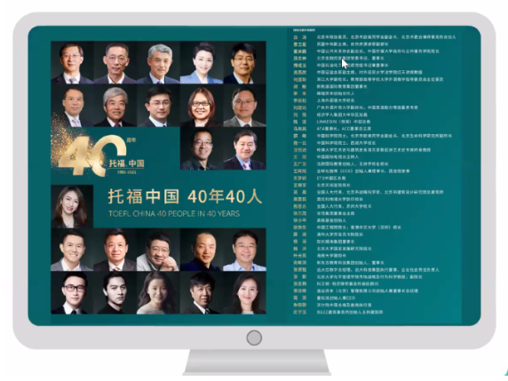 ETS中国在2021年10月23日于欧美同学会会址举办的托福和GRE进入中国40周年盛典上,联合欧美同学会发布“托福中国40年40人”榜单,以表彰过去四十年来四十位有代表性的留学生及对促进国际交流和国际教育发展做出突出贡献的代表人物。