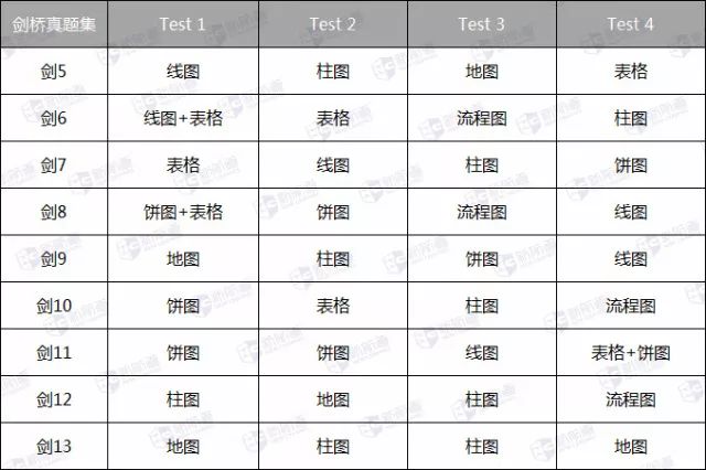 再细致从数据图类型上来看,剑5到剑10的每本剑桥雅思真题中的小作文数据图类型分布较为均衡,但从剑11开始一反常态,在不考虑动静态的情况下,同一类型的数据图反复出现,剑11偏爱饼状图,剑12偏爱柱状图,剑13还依旧爱柱状图爱得深沉。具体可见下表:
