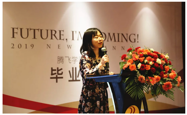 陪伴学生的不止有父母,成长路上,老师为了学生,也是倾其所有、毫无保留。助教鲜于梦妮上台,向即将开启人生新篇章的同学们倾诉了心里话:“在与大家朝夕相处的日子里,发现每位学员都是才华横溢、的个体,无形中自己被大家的活力和热情所感染。不管未来的路多么艰难,都不要轻易摈弃内心的目标。遇到困难,记得发个消息,腾飞永远张开双臂,拥抱大家的笑与泪!”最后,她祝福所有学员前程似锦,学有所成!