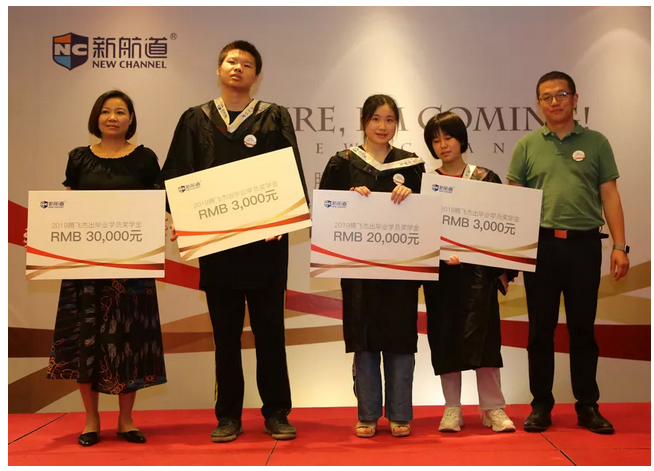 新航道国际教育集团副总裁、武汉学校校长李俊杰为腾飞杰出学员代表颁发奖学金,并合影留念。