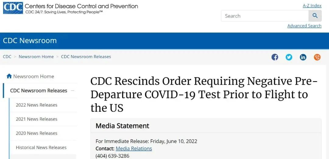 美国当地时间6月10日,美国CDC宣布,要求人们在登上飞往美国的航班之前出示 COVID-19 检测结果为阴性或从 COVID-19 中恢复的文件的命令将被撤销,自 2022 年 6 月 12 日凌晨 12:01 起生效东部时间。