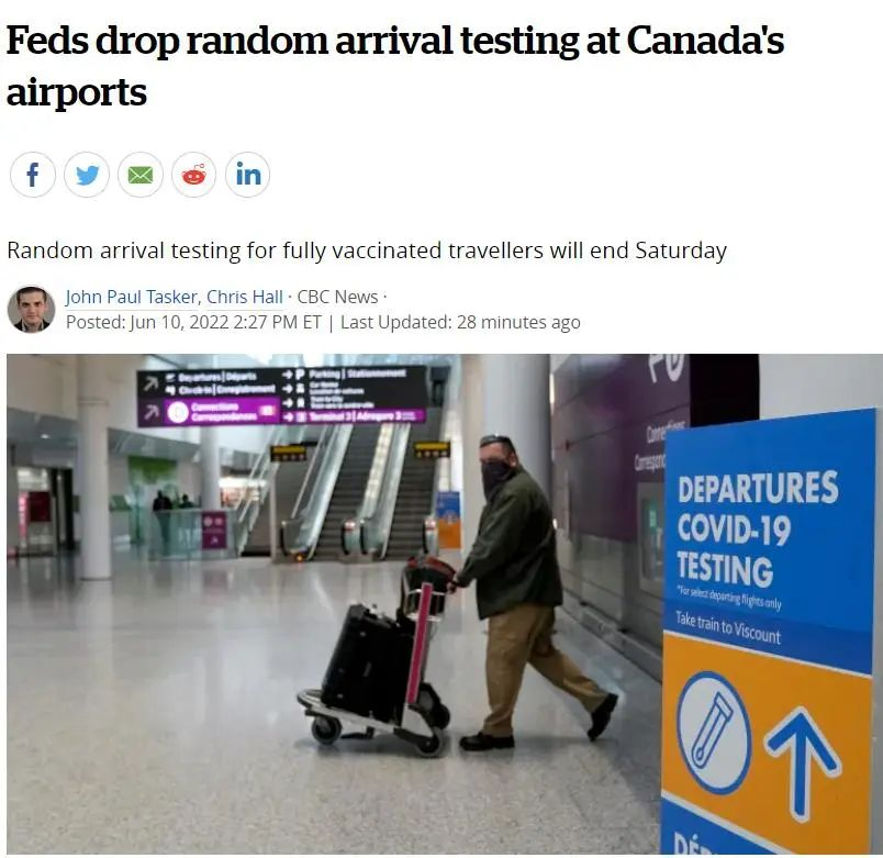 加拿大政府宣布,从6月11日起,暂停已完全接种疫苗的外国旅客入境后在机场的随机核酸检测。