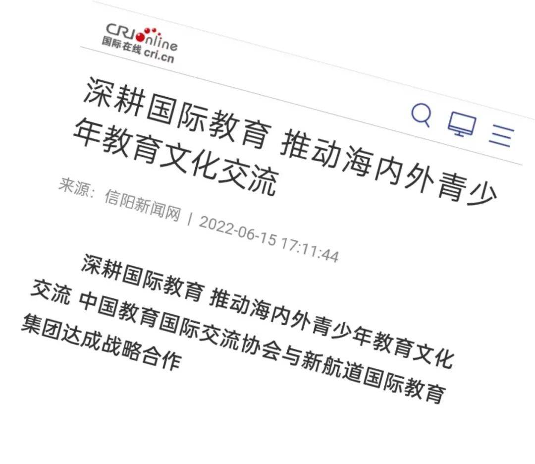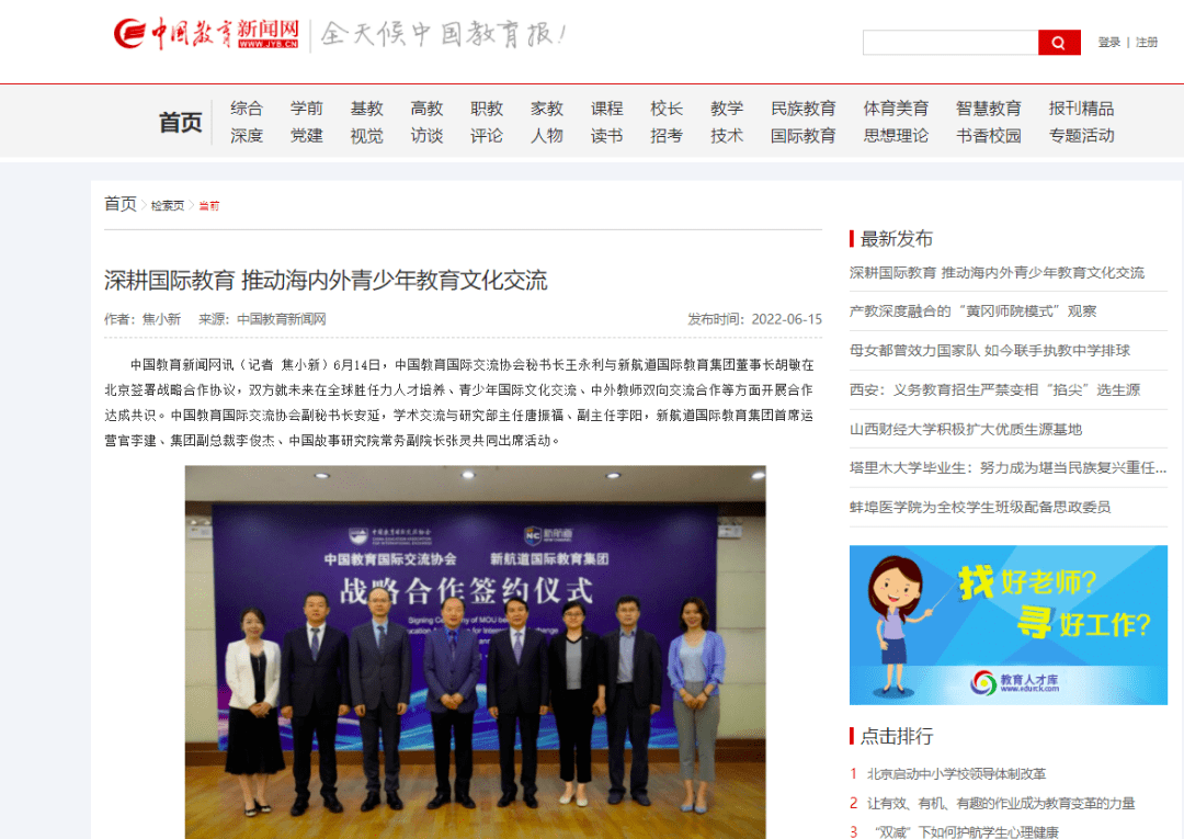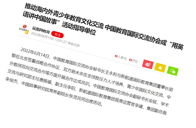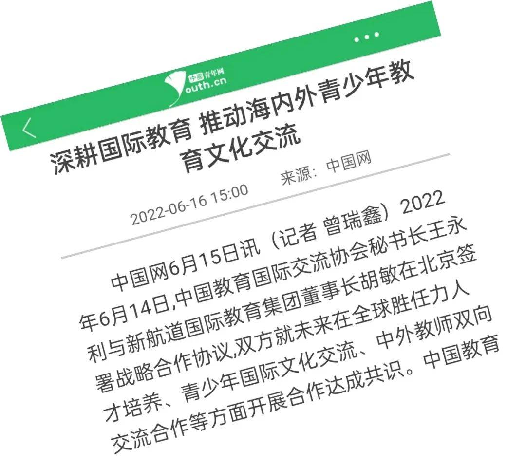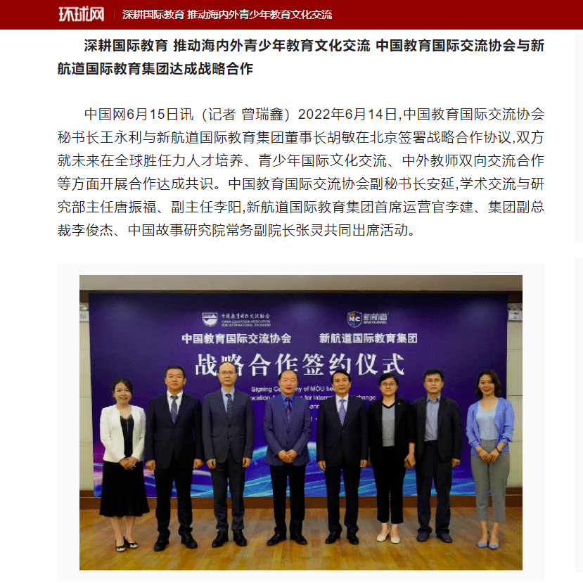 2022年6月14日,中国教育国际交流协会秘书长王永利与新航道国际教育集团董事长胡敏在北京签署战略合作协议,双方就未来在全球胜任力人才培养、青少年国际文化交流、中外教师双向交流合作等方面开展合作达成共识。中国教育国际交流协会副秘书长安延,学术交流与研究部主任唐振福、副主任李阳,新航道国际教育集团首席运营官李建、集团副总裁李俊杰、中国故事研究院常务副院长张灵共同出席活动。