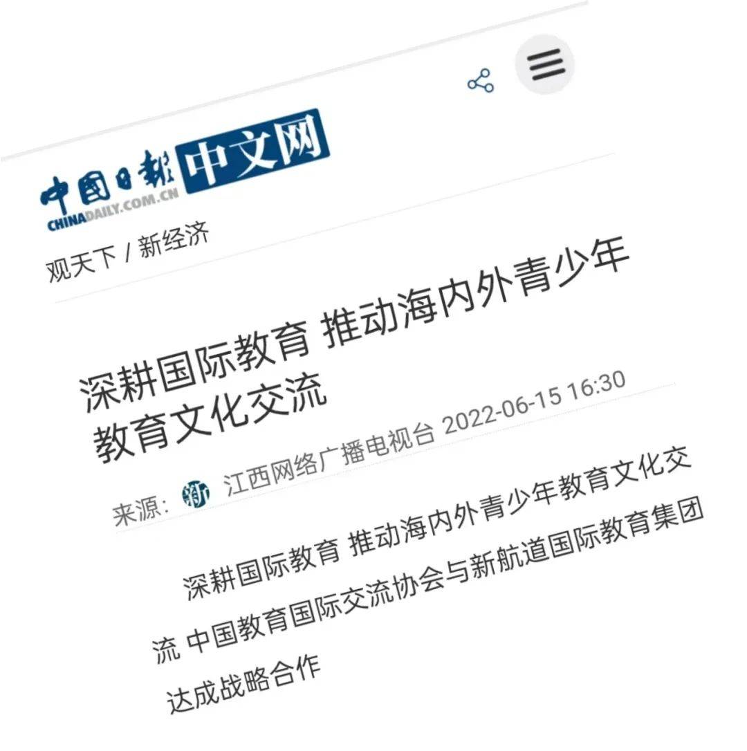 胡敏董事长表示,新航道国际教育集团历经17年发展,助力万千青少年走出国门,已经成为我国国际教育领域一支重要的生力军。自2018年起,新航道策划推出了一批以“讲好中国故事”为主题的双语图书、视频课程,并于2020年、2021年连续两年与中国教育电视台联合主办“用英语讲中国故事”活动,为全球青少年搭建学习、传播和传承中华优秀文化的平台。与中国教育国际交流协会合作是新航道集团发展历程中的一件大事,期待双方继续深耕国际教育,为中外青少年提供多样化的教育文化交流体验,为国家培养更多融通中外、具有国际竞争力的优秀人才。