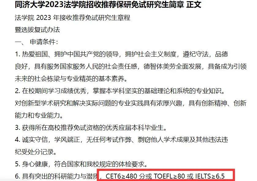 同济大学法学院2023招生简章中,将本科阶段英语六级480或雅思总分6.5及以上或托福考80分及以上列为保研条件。