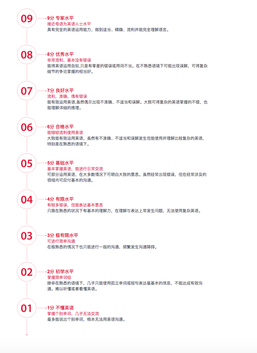 下面带大家看一下雅思九个分数段及所对应的语言能力要求,了解下想拿到高分至少需要达到怎样的标准!