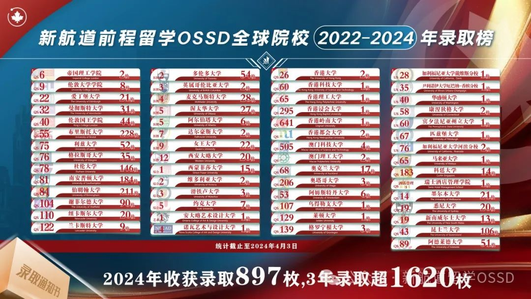 随着各世界名校Offer陆续发放,2024申请季新航道前程留学OSSD学子已收到来自英国/加拿大/澳洲//新西兰/荷兰/新加坡/瑞士/香港(中国)等国家及地区录取Offer超890封。录取院校囊括了帝国理工学院、多大、伦敦大学学院、爱丁堡大学、新南威尔士大学、伦敦国王学院、昆士兰大学、渥太华大学、女王大学等几十所世界名校。不论从院校的层次上来看,还是专业热度,新航道前程留学OSSD都能为学子们实现留学梦想。