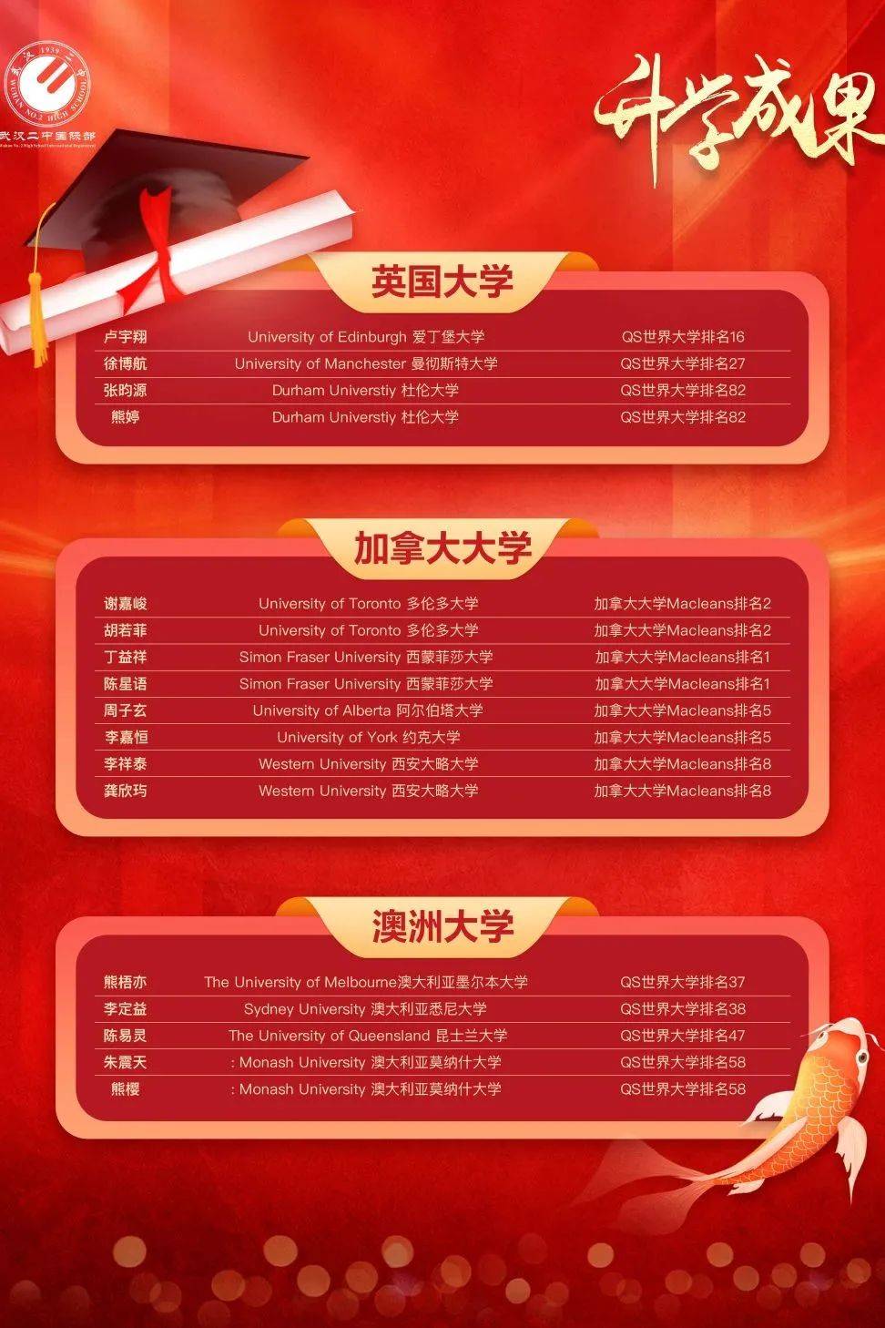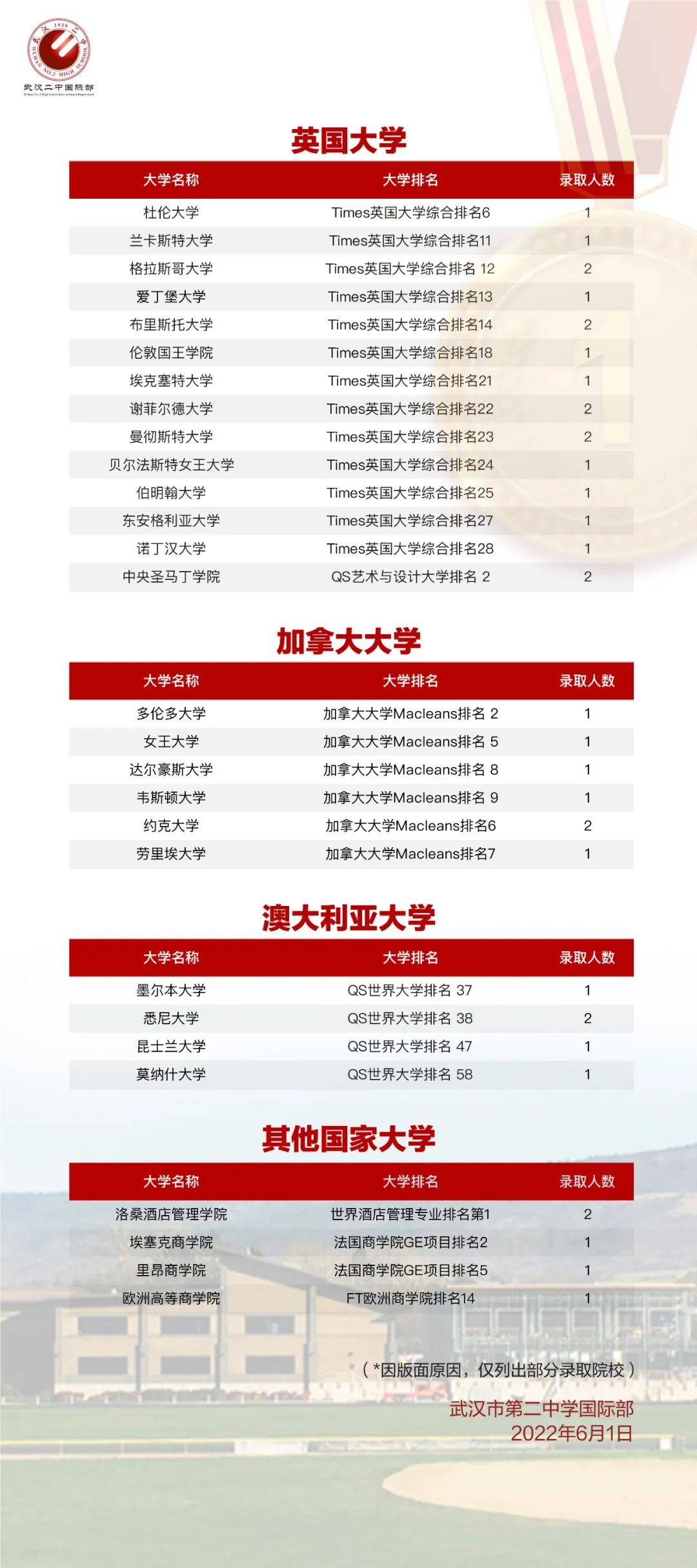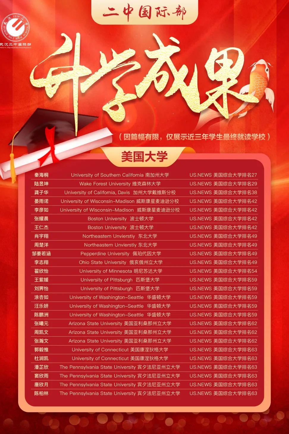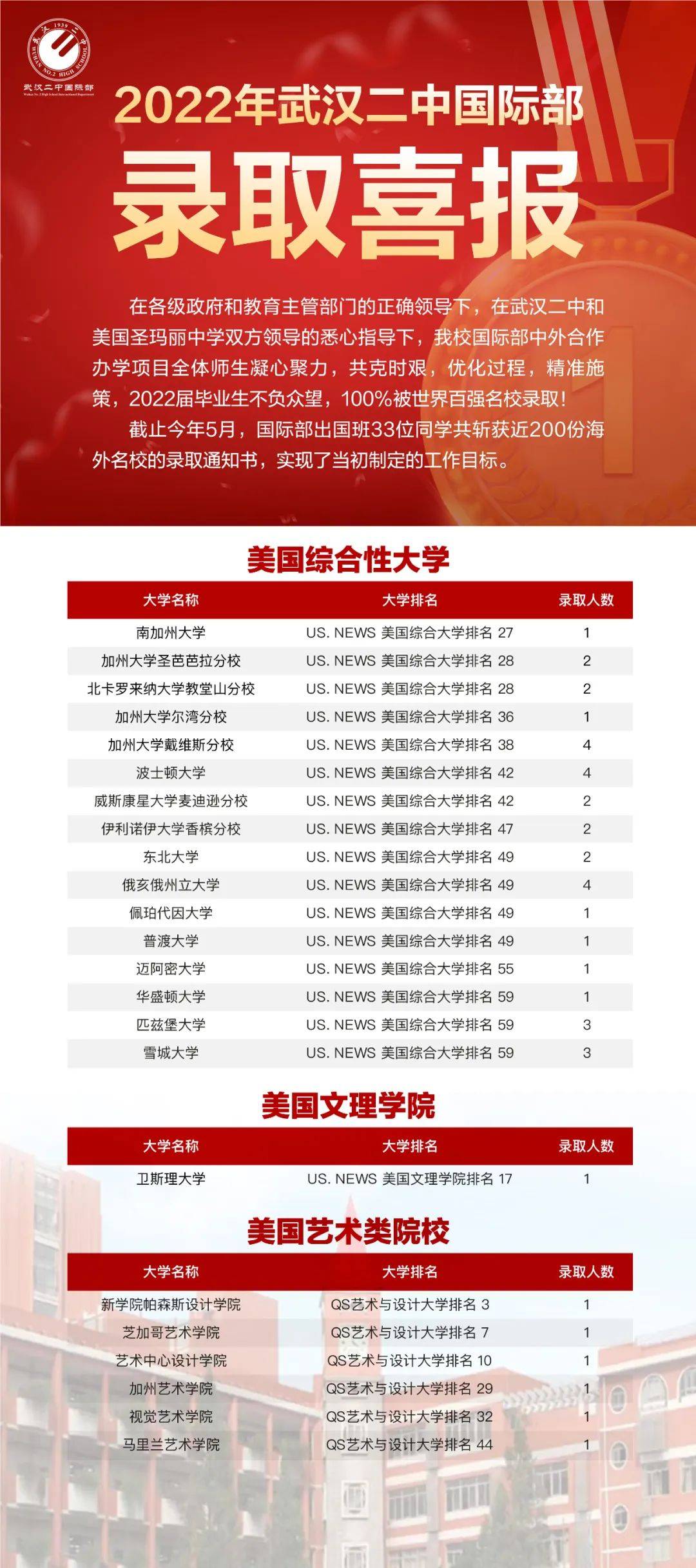 迄今为止,武汉二中国际部(国际班)共有7届学生毕业,毕业生都顺利进入海外正规大学继续深造,专业渠道越来越广,所去国家越来越多。