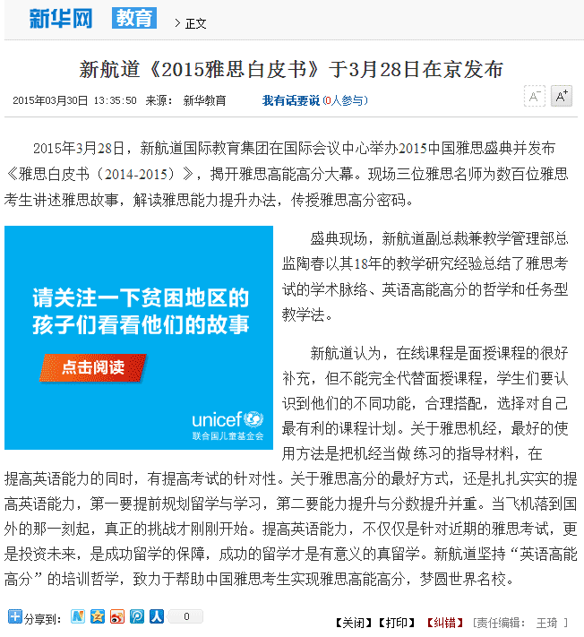 2015年3月28日,新航道国际教育集团在北京国家会议中心举办中国雅思盛典暨《雅思白皮书2014-2015》发布会,众多新闻媒体报道了这一雅思界的年度重大事件。