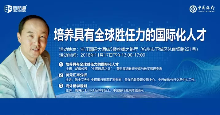 11月17日,由新航道国际教育集团与中国银行浙江省分行联合举办的《培养具有全球胜任力的国际化人才》专题报告会在浙江国际大酒店成功举办。