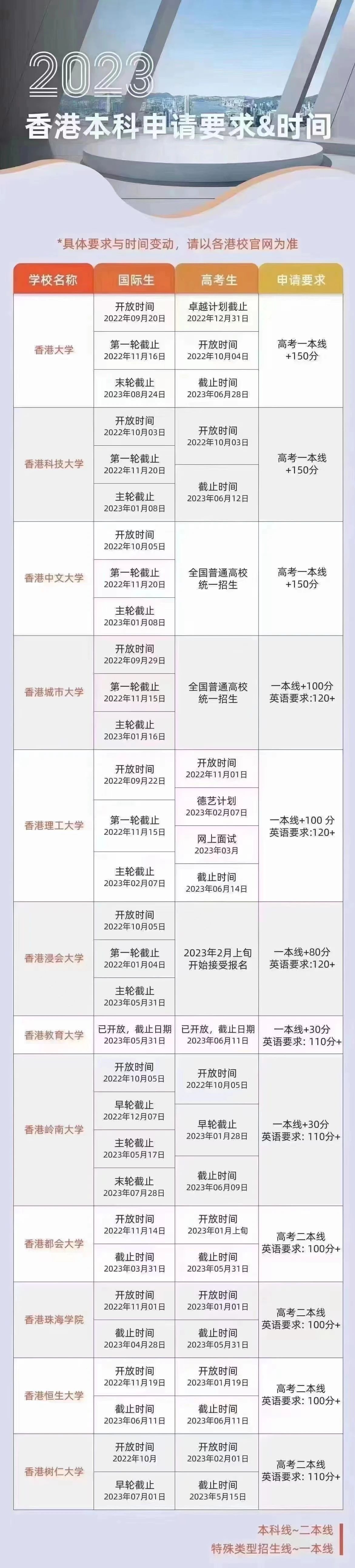 除香港中文大学与香港城市大学为统招,在提前批录取(因在此不赘述)。其余的6所港校(香港大学、香港科技大学、香港理工大学、香港浸会大学、岭南大学、香港教育大学)实行独立招生,考生独立在网上向学校提出申请。