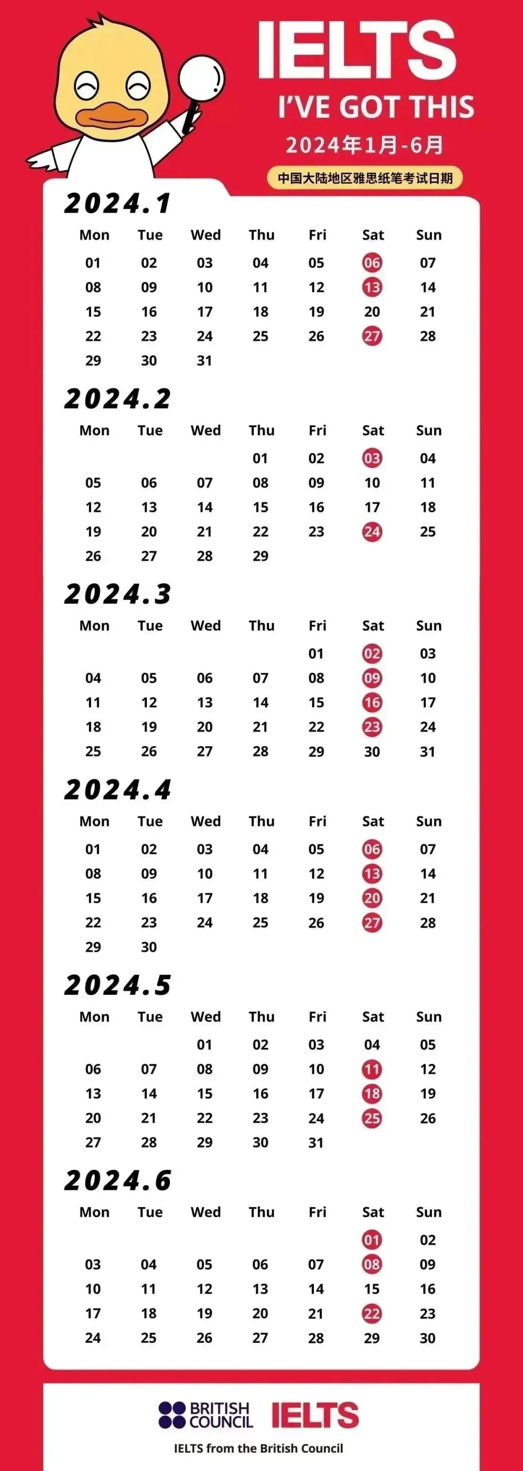 接下来,就为大家奉上新鲜出炉的2024年1月-6月雅思考试日历,考鸭们赶紧选好心仪日期,登录雅思官网报名,以免错过考位!