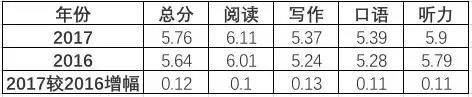 相比2016年,中国大陆考生总分平均提高了0.12分,阅读、写作、口语、听力分别提高0.1分、0.13分、0.11分、0.11分。