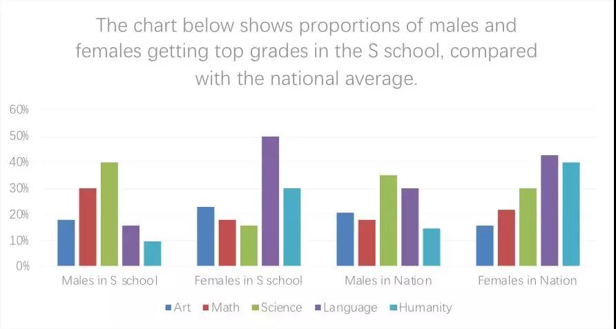 In this school, Science, language subjects and Humanity are three areas where there are marked differences between males and females, ← 总,分 [挑出差异的一个科目,并且交代男女之间的数据关系,别的细节省略。] → and the difference is most distinct [表示程度的形容词,是写作的词汇关键] in language subjects, where 50 percent of females attain top grades, and the percentage is more than three times of that of males. Nationwide, there is a different pattern. ← 总 [借助前面建立起来的语境写,different这个词的含义是指接下来的内容是针对前文内容而来的。],分 → The onlyrealm where the disparity is considerable is Humanity, as femalesoutperform males by a huge margin of 25 percent.