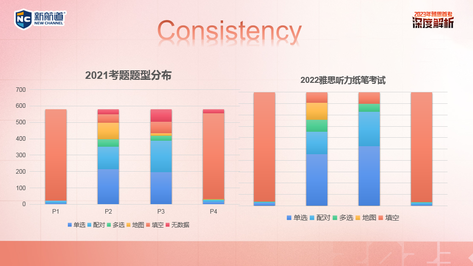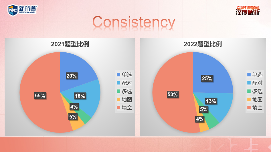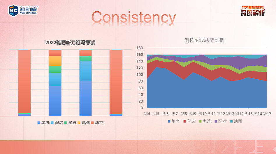 根据《剑桥雅思》4-17题型比例来看,可以得出结论,雅思题型的分布具有一致性的特点。