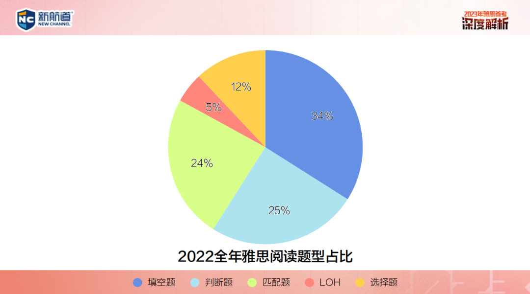 在对五大题型有所了解后,张孟雨老师展示了2022年全年雅思阅读题型占比,其中占比较多的为:填空题(34%)、判断题(25%)、匹配题(24%)。