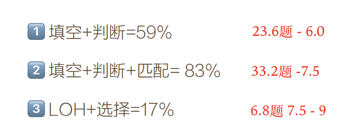 按照该逻辑,填空题+判断题+匹配题合计占83%,相当于33.2题,换算成分数为7.5分;因此在6分段的同学若想提高分数可以花费一些精力放在匹配提上。