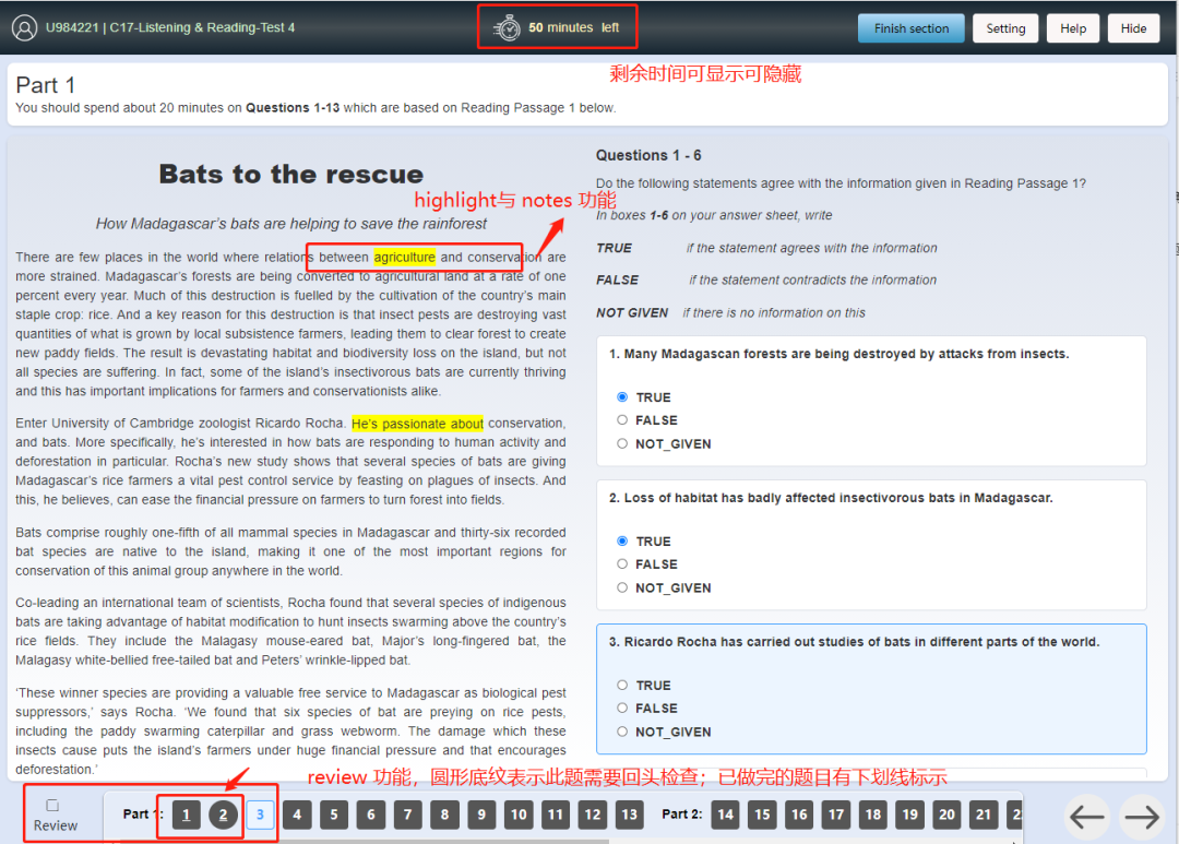 在模考状态下,为了再现考试的紧张感,平台准备了倒计时功能,帮助大家掌控时间脉搏,及时调整做题节奏;而听力、阅读的记笔记 (note-taking) 和高亮键 (Highlighting button) 功能则可以帮助考生们速记整理,有的放矢进行答题,再也不用担心遗漏关键信息,影响做题速度;听力阅读的拖拽功能 (drap and drop) 同样高度还原真实机考场景,帮助考生们熟悉具体题型的操作,在真实考试中淡定自如丝毫不慌;在页面的左下角,还添加了“Review”功能,可以将不确定的答案题号变成圆圈状,在完成其他题目后,回头检查确认答案,做题的流畅,避免在一道题上花费太多时间而因小失大。