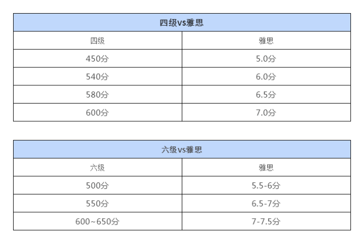 在这一点上,有必要在英语四、六级考试成绩和雅思成绩之间创建一个分数转换表。
