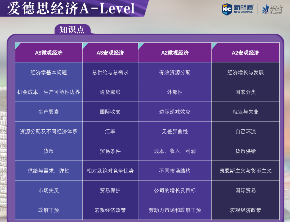 从内容层面来看,A-Level经济分为宏观经济和微观经济两个部分,宏观经济学包括对GDP、失业率、通货膨胀、储蓄、投资、能源、国际贸易和国际投资的研究,是从整体上看经济,探索大公司和政府的决策,以及它们对整体经济的影响。微观经济学的主题包括机会成本,供给和需求、弹性、市场结构、劳动力市场和定价。微观经济学研究的是个体经济学,例如单个生产者、单个消费者、单个商品。