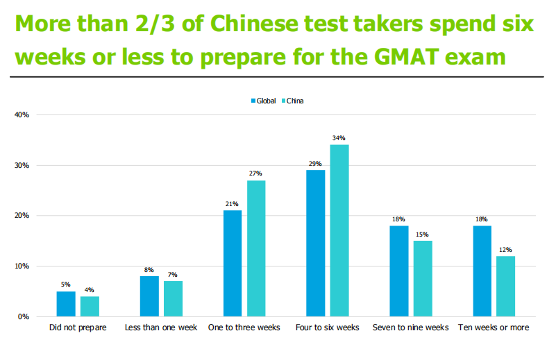 从GMAT考试官方给出的数据我们可以看到,在中国,大部分考生的备考时间集中在4~6周。