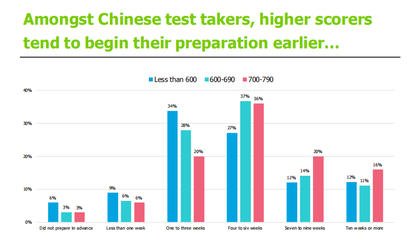 GMAC的数据显示,备考4~6周的同学取得700+的成绩也是最多。