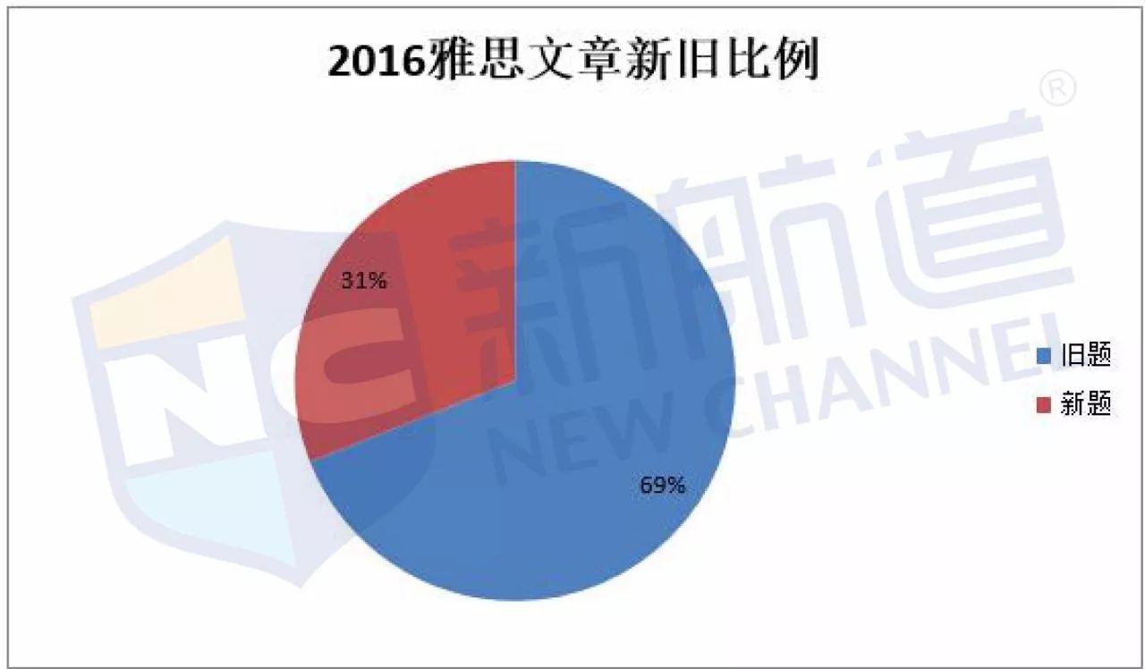 有上图可以看出,在2016年阅读考试中,雅思文章的旧题出现70篇,新题32篇,旧题比例69%,对比2015年的67%稍有变化。与去年相比,今年的新题篇章有所减少,与旧题呈现1:4的比例,但出现时间却相对集中,刚好肩并肩凑在了暑期的考试高峰,毕竟烤鸭一生英语的就是高考的时候,这也算是来自大洋彼岸的善意吧!每月总共12篇考题,连续三个月出现了近一半的新题。也许一方面暗示了British Council对抗各路点题预测的决心,另一方面也将备考引回到了巩固单词、扎实复习题型特点和解题思路的基本功方向。这一现象究竟是巧合,还是官方的刻意为之,雅思阅读未来会不会像口语那样出现集中的“换题季”现在判断还为时尚早。