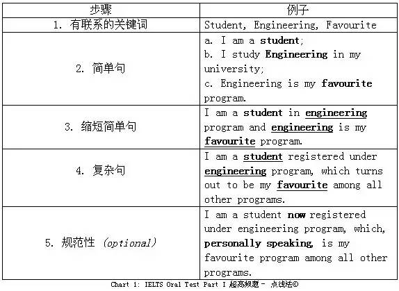 首先,在大脑里形成一串关于问题答案的关键词。例如:Student,engineering, 和favourite。之后,不同于原来的三个独立的简单句,尝试着把这三个相互关联的词汇放到一个句子里面: