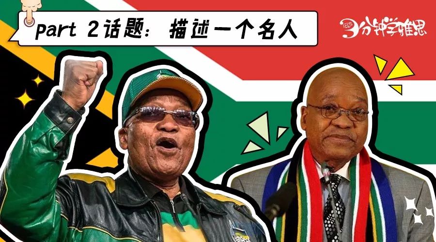 雅思口语话题part2:描述一个名人!南非总统雅各布·祖马说英语时嘴上拌蒜,近日一段几年前的演讲视频又火了,他在说“in the beginning”时足足卡顿了半分钟,最后愣是没念对,每次念错还总是扭扭身子卖卖萌,真的太萌啦!在本次的口语题库中,我们可以借用:描述一个有名的人来聊聊这位可爱的总统!