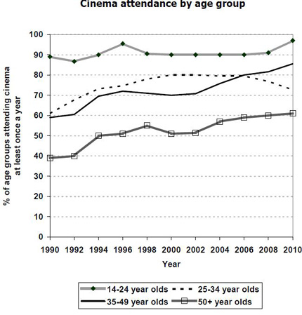 The oldest people seem to go cinema less than the other groups but the percentageof the attendance has slightly going up by 15% from 40% to 55% between 1990 to 2004 and it will keep increasing to 60% by 2010.