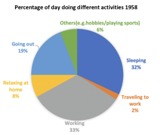 [2024/ 3/ 16] The pie charts below show the percentage of time working adults spent on different activities in a particular country in 1958 and 2008.