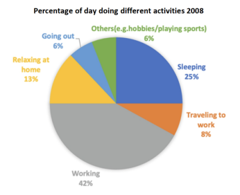 In the year 2008, the proportion of time people spent on working and relaxing at home saw a remarkable rise to 42% and 13% respectively. The most drastic change could be found in the time allocated for commuting, with the figure growing by 4 fold. By contrast, there was a sharp decline in the percentage of time distributed to going out and sleeping by 13% and 7%. In this year, people still spent 6% of their time on other activities.