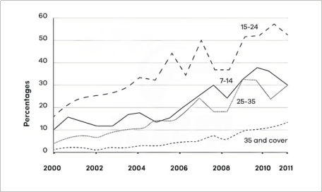 Looking at the information in more detail, we can find that 15% of people aged 15-24 went to the cinema monthly in the initial year. After a remarkable rise to over 30% in 2004, this figure fluctuated between 35% and 52% for several years, peaking at 58% in 2009. By contrast, the oldest group(35 and over) had the lowest cinema attendance in the 11 years, growing steadily from roughly 2% in 2000 to 12% in 2011.