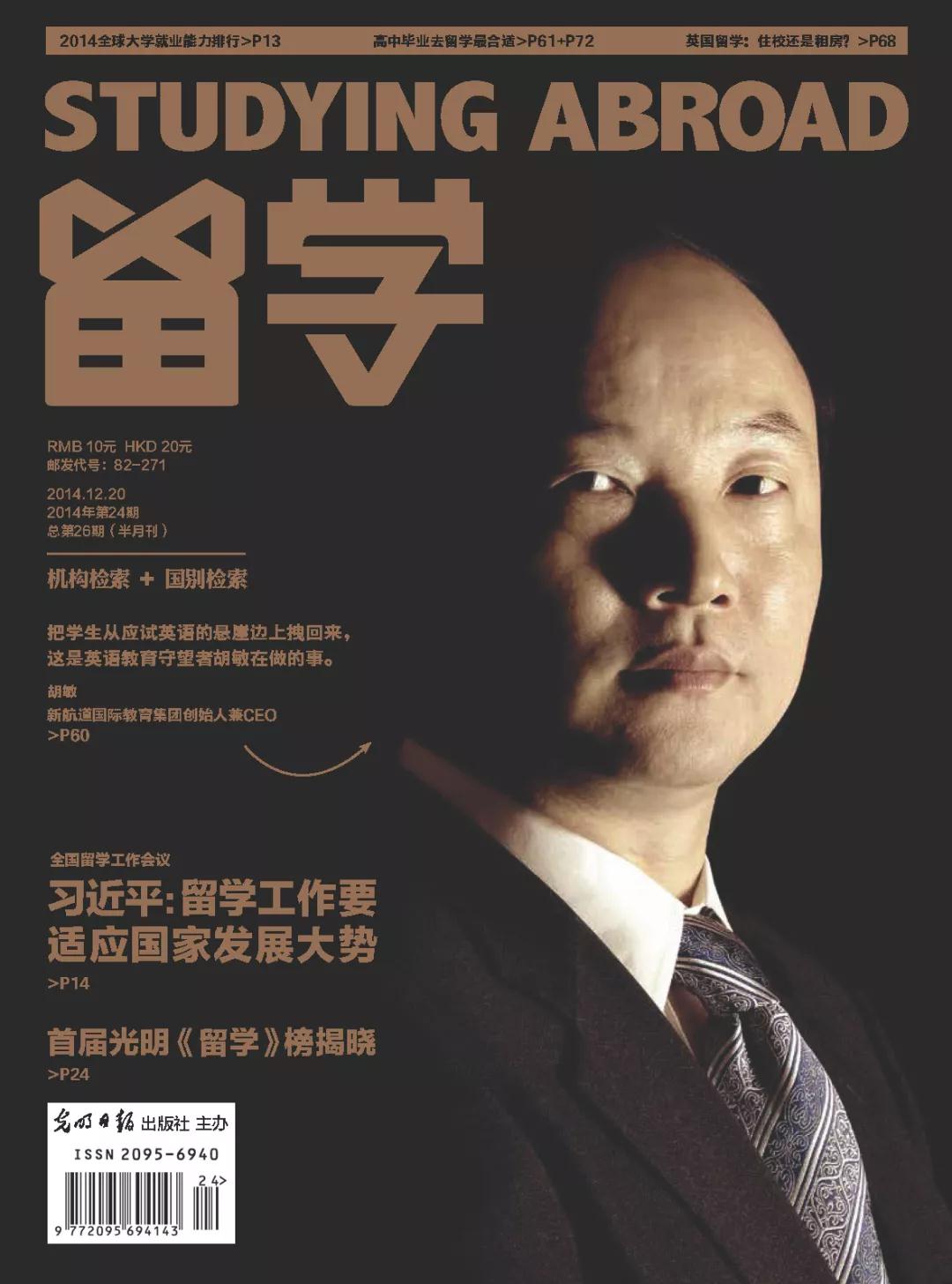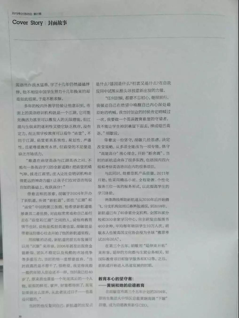 从萌芽期到成长期,再到成熟期,中国的留学行业优胜劣汰,但也有一些机构继往开来、另辟蹊径,在留学圈里生生不息,胡敏和他率领的新航道就是这样的机构。2019年第1期《留学》杂志在封面人物一栏中也对胡敏和新航道进行了报道,以下是报道全文:
