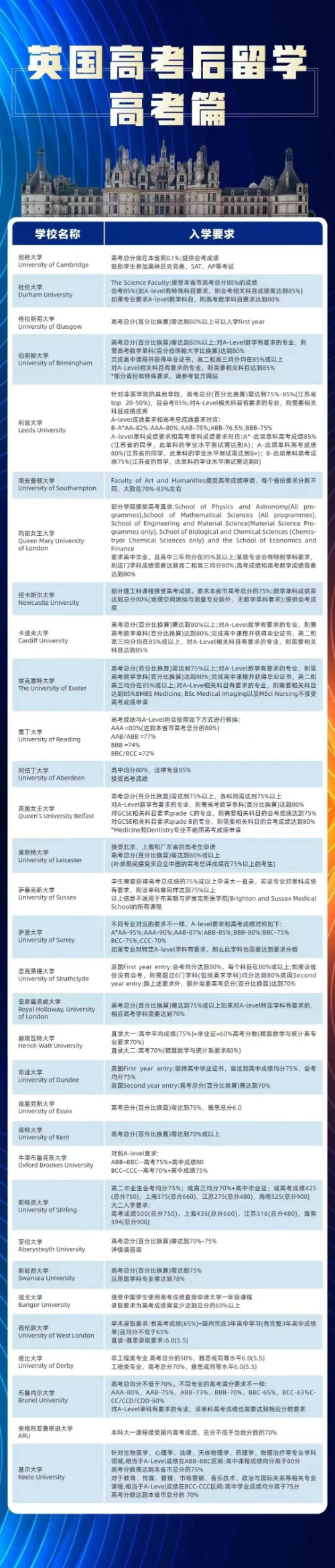 越来越多的英国大学承认国内高考成绩,学生可凭高考成绩直接申请入读英国大学的本科课程,也不用进行额外的准备,又节约时间,三年即可获得英国本科学位,高考后无缝衔接英国大学。